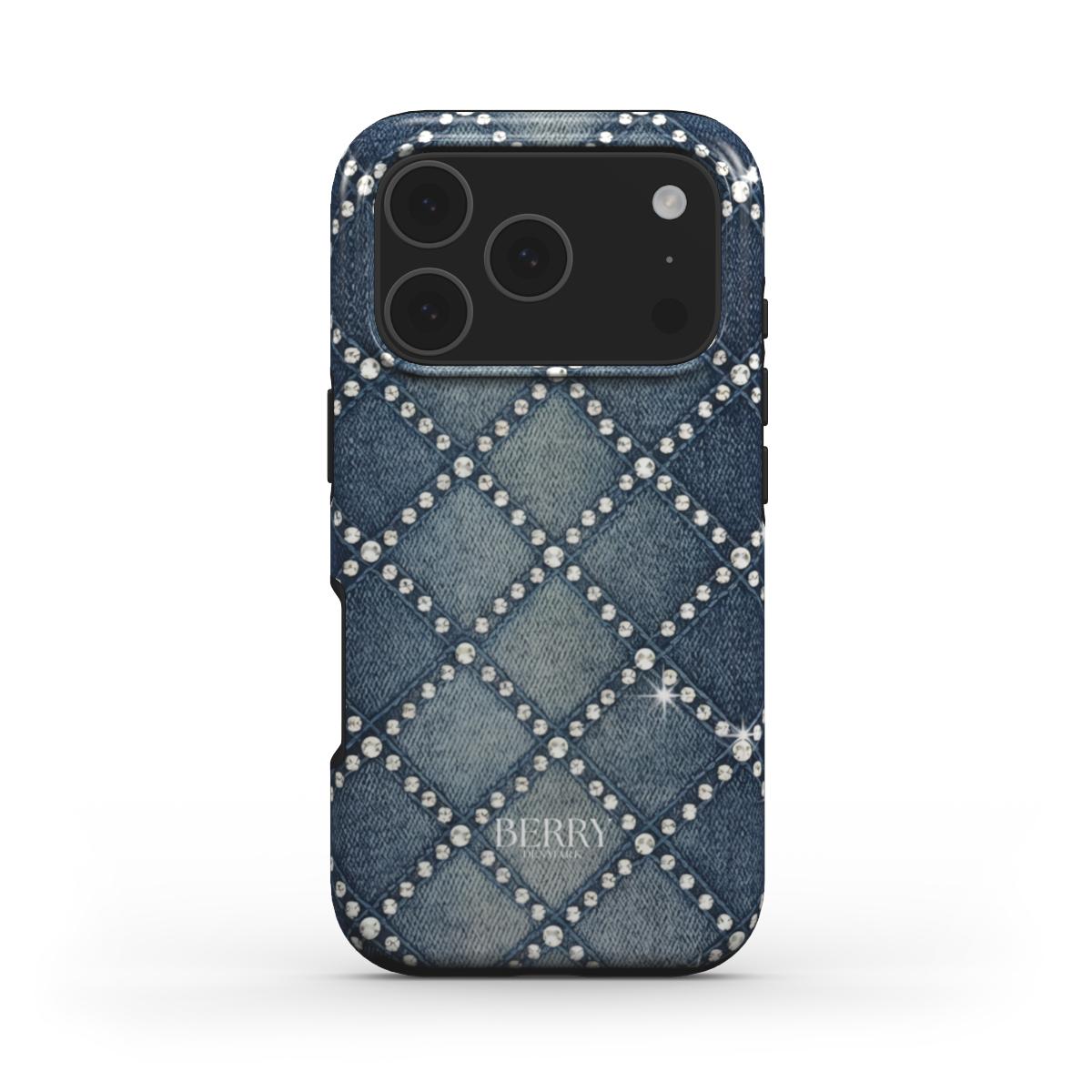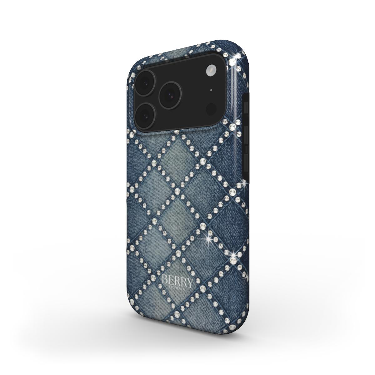 00s Denim er iphone coveret til dig der stadig har et svagt punkt for y2k, low rise jeans og lip gloss i tasken. Denim mønsteret med små sten sat i rudemønster giver din telefon samme energi som en vintage designer bag, bare i jeans version. Perfekt til hverdags outfit med denim on denim, men også til kjoler når du vil bryde looket med noget mere casual og fun. Et iphone case til hende der elsker denim, glitter og følelsen af at mobilen altid matcher hendes favorit jeans.