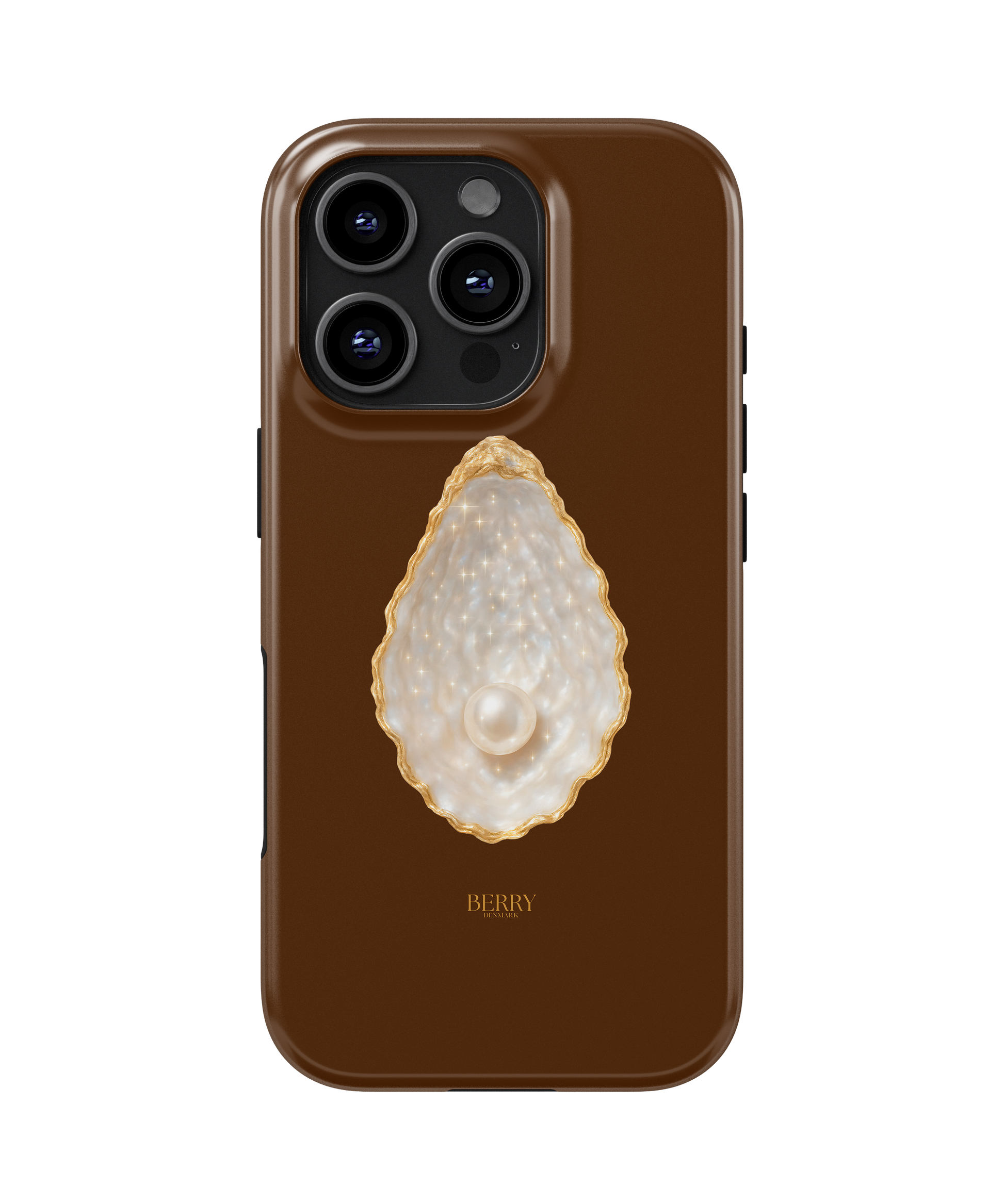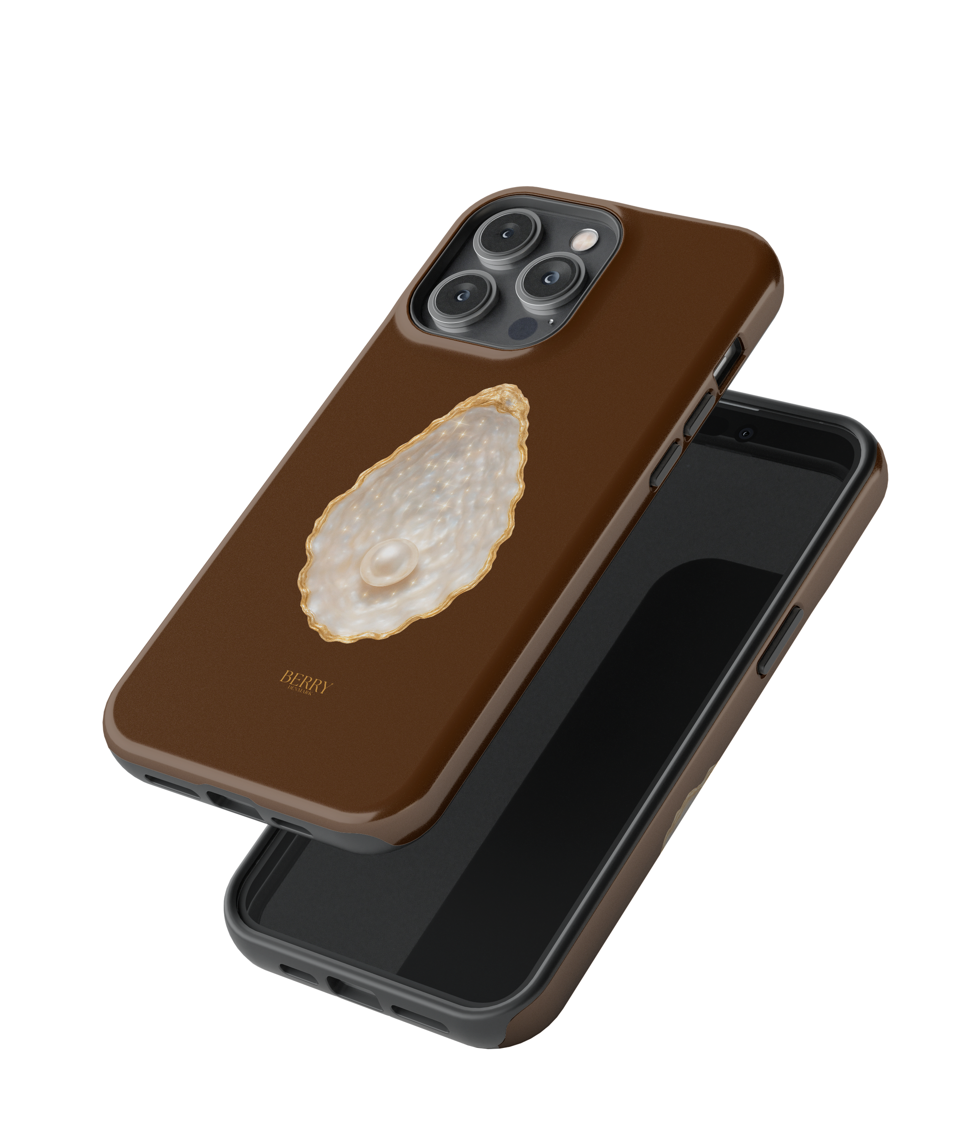Pearly Chocolate kombinerer den dybe chokoladebrune base med et detaljeret østersdesign og en glimtende perle. Resultatet er en case, der balancerer varme nuancer med eksklusiv elegance og et design der føles både klassisk og unikt.